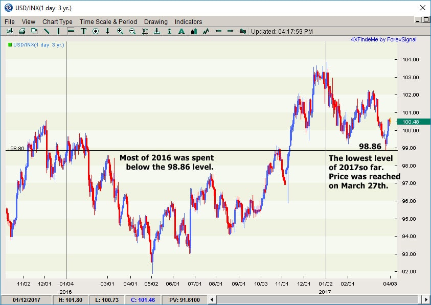 The USD Index, a sentiment marker of the strength of the USD against a basket of other currency pairs, touched its lowest price of 2017 on March 27th at 98.86. Let us put this into perspective though, the low for 2017 is still a higher than what we saw for most of 2016.